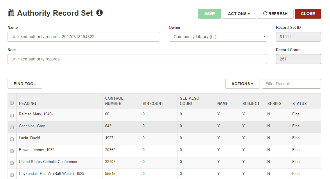 - If you created an authority record set, the following note appears on the Authority Record Set workform: Unlinked authority records.