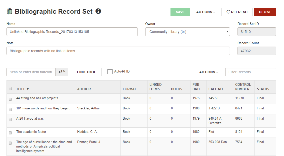 You can automatically create a record set of bibliographic records that are not linked to any item records or a record set of authority records that are not linked to any bibliographic or authority records.