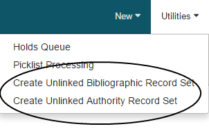 - Select Utilities > Create Unlinked Bibliographic Record Set or Create Unlinked Authority Record Set.