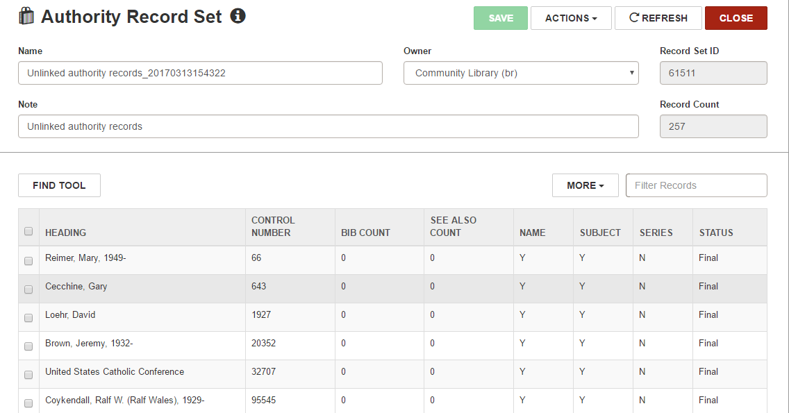 - If you created an authority record set, the following note appears on the Authority Record Set workform: Unlinked authority records.