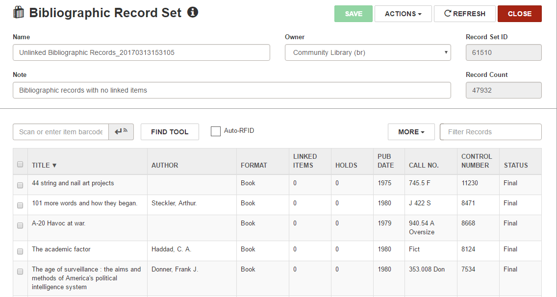 You can automatically create a record set of bibliographic records that are not linked to any item records or a record set of authority records that are not linked to any bibliographic or authority records.