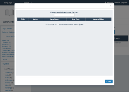 When the patron clicks Estimate Overdue Fines, a light box displays the title, author, item status, due date, and accrued fine for each overdue item, as well as the total due as of the current date. If you have opted to include claimed and/or lost items in the estimate, these are included in the display and calculation.