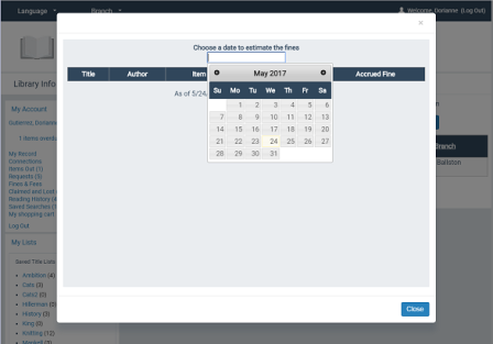 ExpressCheck users can estimate fines using a dashboard control in the patron account. The patron sets the date and clicks Calculate.