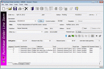 If the purchase order was created with a template that has a default line item, the order has one line item containing a distribution grid (segments), but no bibliographic information. See Create a purchase order with a template or workform.