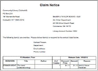 You can print claim notices for the titles your library is claiming. Polaris generates a notice for each supplier with one or more claimed titles. There are two types of notices: the Initial claim notice that includes all the titles being claimed for the first time, and the Claim notice that includes all the titles already claimed.