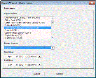 6. Select Branch > Library > or System in the Return Address box to specify the address to use for the claim notice.
