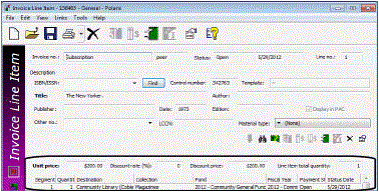 If the invoice line item is not already linked to an active purchase order line item, you can link one or more subscriptions that are not linked to a purchase order. A separate invoice line item segment is created for each serial holdings record with a unique combination of destination and collection. If the serial holdings record is linked to a subscription record, the unit price and the fund in the subscription record are copied to the invoice line item.