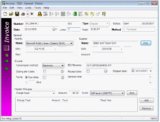 EDI invoices are created automatically in Polaris using data retrieved from the supplier’s FTP server, and an email message notifies you that the invoice is available. You can search for EDI invoices by the invoice number suffix EDI.