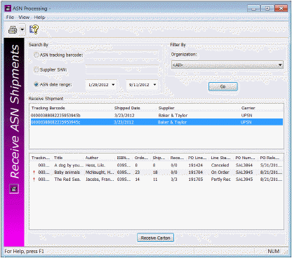 1. Select Acquisitions > EDI Services > Receive ASN Shipments.