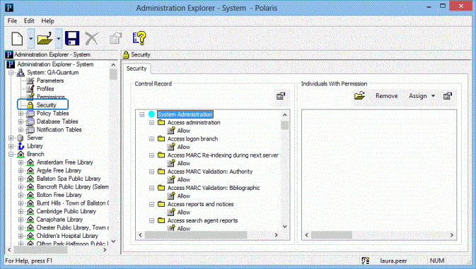 - Select (highlight) System Administration in the Control Record list, and press ALT+* (on the numeric key pad). The System Administration permission tree expands to display all the System Administration permissions.