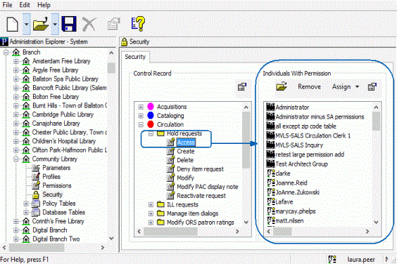 - Click Remove in the Individuals with Permission tool bar. The selections are removed from the list, and no longer have the permission assignment.