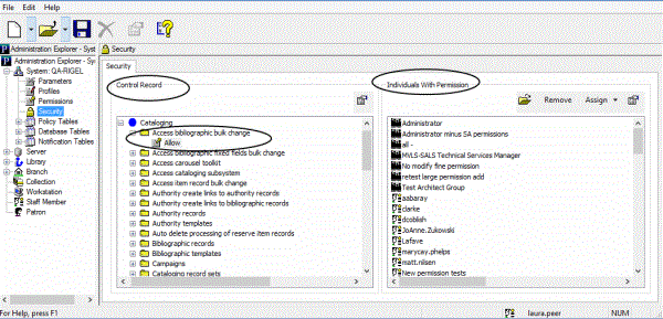 In the Security view, the Control Record list displays all the permissions available for that level, organized in subsystem folders. The Individuals with Permission list displays all the staff members, workstations, and permission groups that have a selected permission.