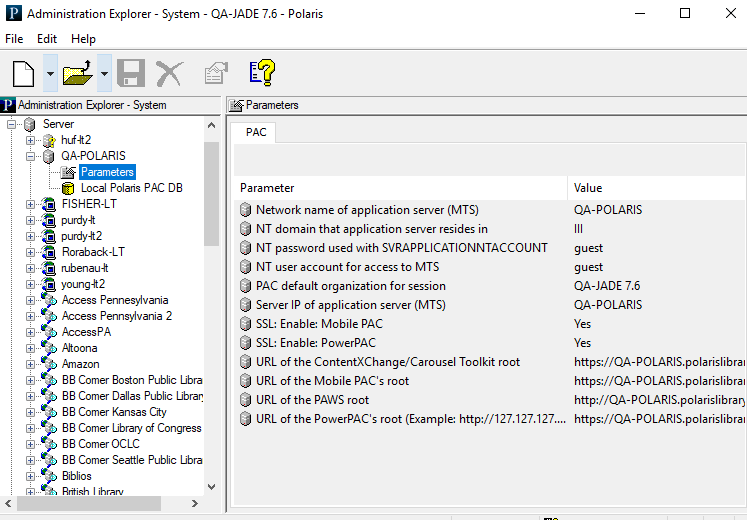 - Select Parameters under the server. The PAC parameters tabbed page appears in the details view.