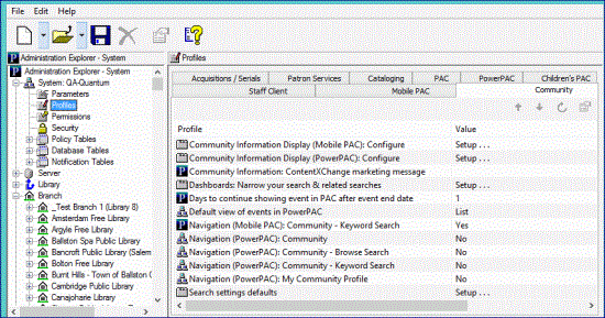 - In the Administration Explorer tree view, open the Profiles folder for the organization, and select the Community tab in the details view.