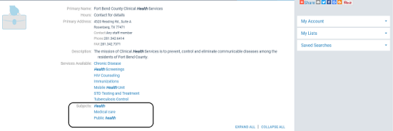 When users search for community information in the PAC, they can search by the organization’s name, address, contact persons, services, event or program title, subject, or notes.