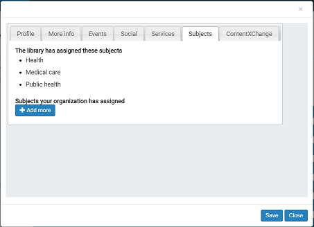 The subjects that the library staff member entered, if any, are displayed. Click Add more to add another subject. You can continue to click Add more as needed.