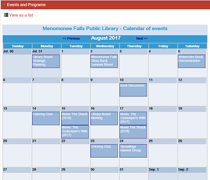 If your library offers this option, the Events and Programs drawer in the PowerPAC full display includes an option to display the events in a calendar or a list view. If the event is displayed in a calendar, the PowerPAC user can select View as a list. If the events display in a list, the PowerPAC user can select View as a calendar.