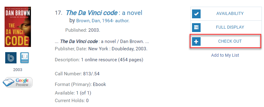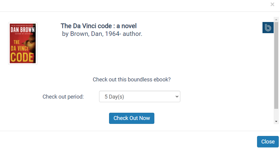 To check out the electronic resource in the PAC, the patron logs in to their account, and selects the Check Out button, which opens a dialog.