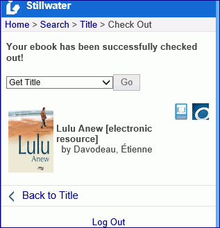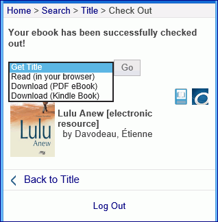 A message confirms that the check-out occurred, and the Get Title drop-down list contains the download formats for the eContent.