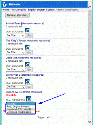 The patron selects an option in the Get title list, and the eContent is downloaded to the patron's phone or device.
