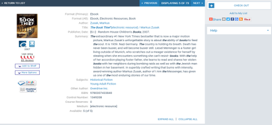 The product page (full display) for eContent is similar to the full display for other bibliographic materials.