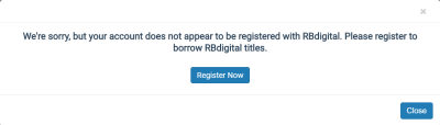 To comply with the RBdigital requirement that all borrowers of its eContent be registered, a message in Polaris PowerPAC notifies patrons who have not yet registered that they need to register. When a patron clicks a button to check out or place a request for an RBdigital title, a message appears if the patron is not yet registered with RBdigital.