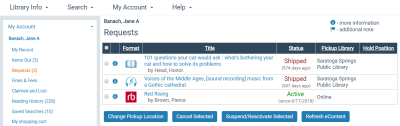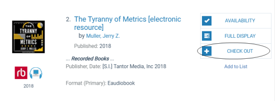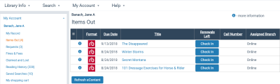 From the patron account Items Out list, the patron clicks Check In to check in a Recorded Books title before it expires.
