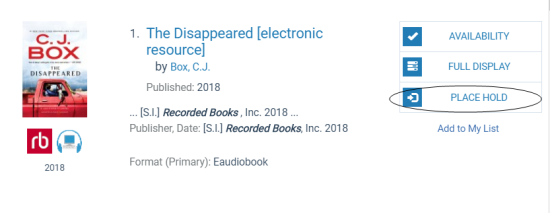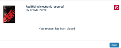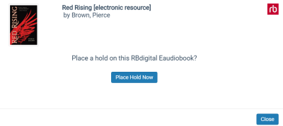 If the RBdigital title is not available for check-out but the logged-in patron can place a hold request on the title, the PLACE HOLD button appears. The patron clicks the PLACE HOLD button, and a confirmation message box appears.