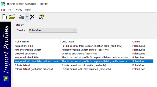 The Integrated eContent bibs (without items) import profile is used to import RBdigital titles. It is listed when you filter the import profiles by Creator > PolarisExec.
