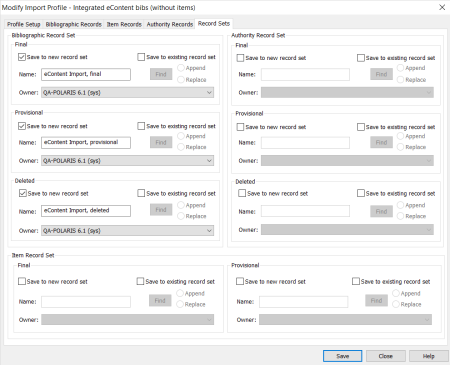 All options set on the Bibliographic Records and Authority Records tabs are the same as those set in the Integrated ebook Bibs import profile, except the Item Records tab, which has no item-creation options selected because no item records will be built. In addition, the record set names defined on the Record Sets tab of the Integrated eContent bibs (without items) import profile begin with eContent instead of EBook.