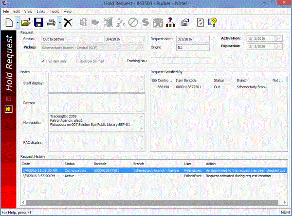 The Hold Request workform > Notes view, Request History pane displays An item linked to this request has been checked out in theAction column.