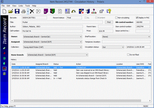 When the item is received at the borrowing library, an INN-Reach API message is sent to the Polaris library that automatically checks out the item to the virtual patron, updates the item's circulation status to Out, and updates the hold status to Out to patron.