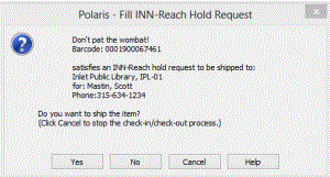 When Yes is selected, the item's status is updated to Held, and the request status is updated to Shipped. An INN-Reach API message is sent to the borrowing library indicating the item has been shipped.
