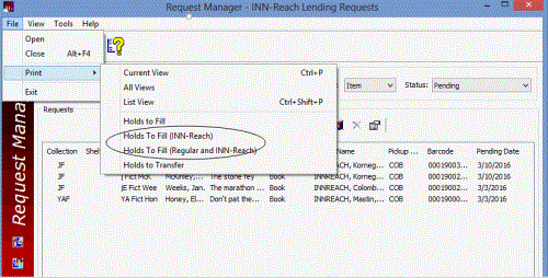 - If there are INN-Reach hold requests waiting to be filled, select either Holds To Fill (INN-Reach) or Holds To Fill (Regular and INN-Reach), depending on whether you want INN-Reach hold requests on a separate or combined requests-to-fill list.
