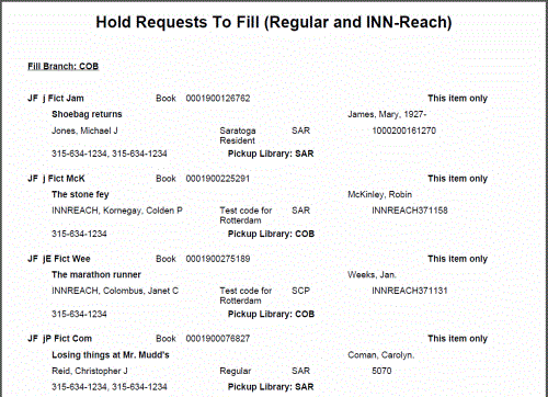 The Hold Requests To Fill (INN-Reach) list (or the combined list) is printed.