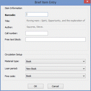 If a matching item template is found, the Brief Item Entry dialog box opens with the Circulation Setup information filled in from the INN-Reach item template.