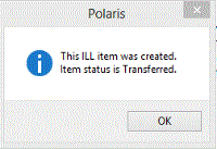 A staff member enters a barcode so that the item can circulate in Polaris, and an optional call number and free text block, and clicks OK. A message confirms that the ILL item was created and indicates the item was transferred (if the receiving branch is not the patron's pickup branch). If the receiving branch is the same as the pickup library, the item status is Held.