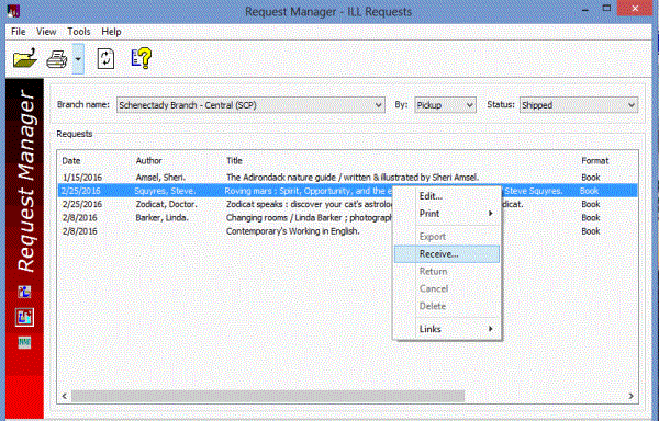When the physical item arrives from the remote library, a staff member goes to the ILL Requests view of the Request Manager and locates the INN-Reach hold request. Then, the staff member right-clicks the request and selects Receive from the context menu.