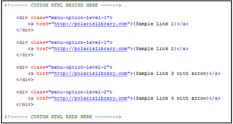 - Working in Links.xml, define the custom links. The template file /Custom/Links-template.xml includes detailed step-by-step instructions for setting up a /Custom/Links.xml file.