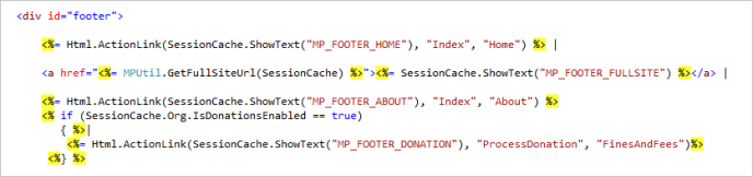 To add links to the footer, edit MobilePAC/Views/Shared/Site.Master in the section of code shown below: