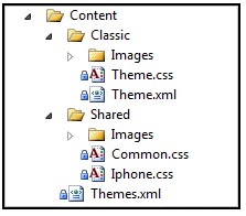 Any CSS style information included in a specific theme supplies only the values that need to be overridden for that theme, not every style defined in the common files in Content/Shared.
