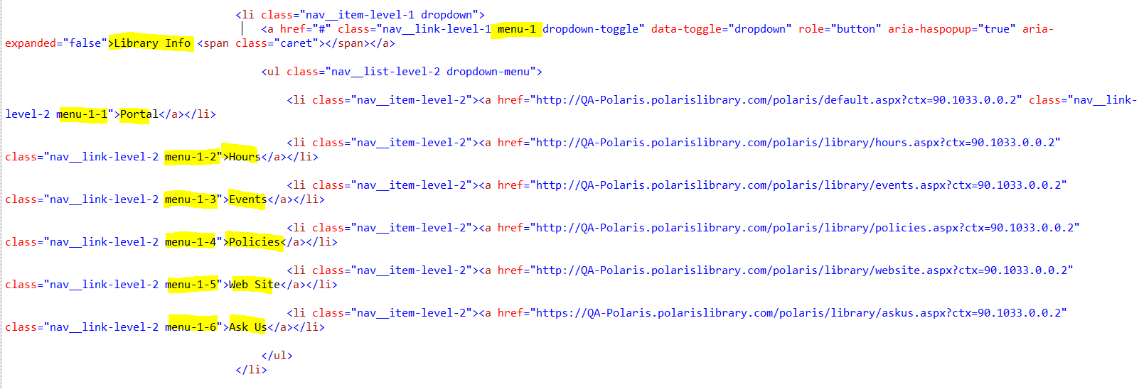 Library administrators who analyze PAC usage statistics using a third-party analytics tool can gather data regarding usage of menus in the header. To enable the usage statistics, an individual class identifies each menu and sub-menu option in the headerdata.xml file.