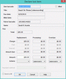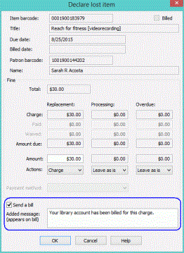 When you declare an item lost, you can manage any charges for the lost item and (optionally) bill the patron for the charges.