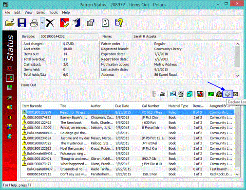 The Items Out view appears, but the item declared lost no longer appears in the Items Out list. If you paid or waived an amount and you set Polaris to print fine receipts from the Patron Status workform, a receipt prints. See Setting Up Receipt Printing from Workforms.