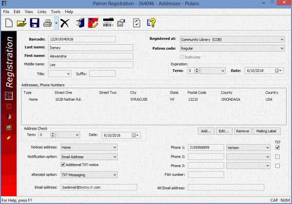 - The Patron Registration workform displays patron registration data, including general, address, and notification information. If your system includes patron photo identification, the Patron Registration workform also includes a photo view.