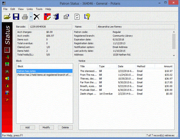 or press F8 in the Patron Registration or Patron Status workform to open the properties sheet. (You can also view a patron’s property sheet directly from a Find Tool results list, without opening the record. See Finding Patron Records.)