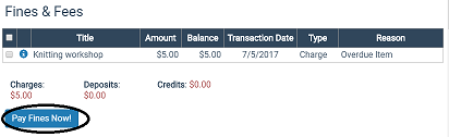 If both the patron's registered branch and the PAC connection branch are set up with an e-commerce provider to allow credit card payments from PACs, patrons can pay charges from the Fines & Fees view in their library accounts. The patron selects the charges to pay and clicks or taps Pay fines now. The example below shows the Fines & Fees view in PowerPAC.