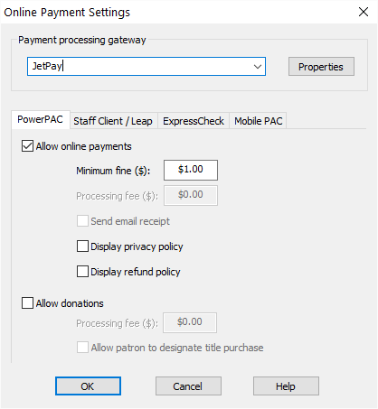 5. Processing fee -This is controlled completely by JetPay and should be set up there. To charge a processing fee for fine payments, enter an amount in the Processing fee box. The maximum value for this setting is $20.00. The default value is $0.00.