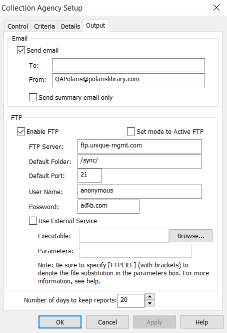 - Default Folder - Type this organization’s folder name as it exists on the agency’s FTP server. See Collection Agency Reporting via FTP.