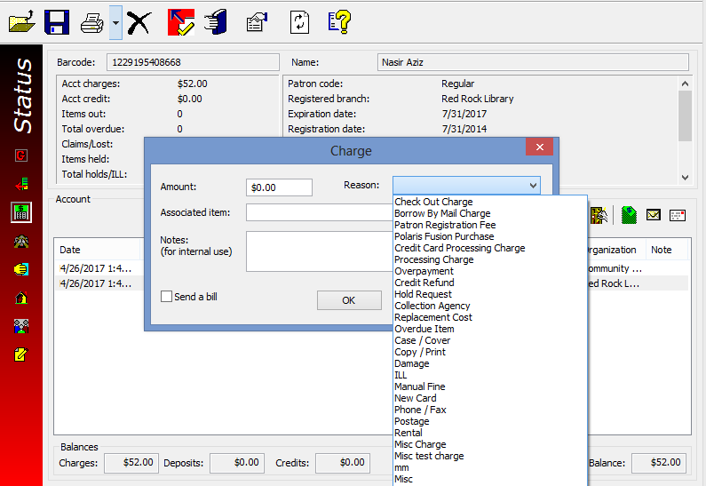 The fee descriptions you define in this policy table appear as selections on workform views and dialog boxes where you handle patron charges. For example, when you add a charge to a patron's account, you can select a reason for the fee from the Reason list. Fee descriptions also appear in Leap.
